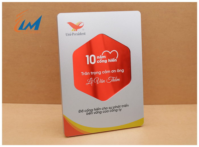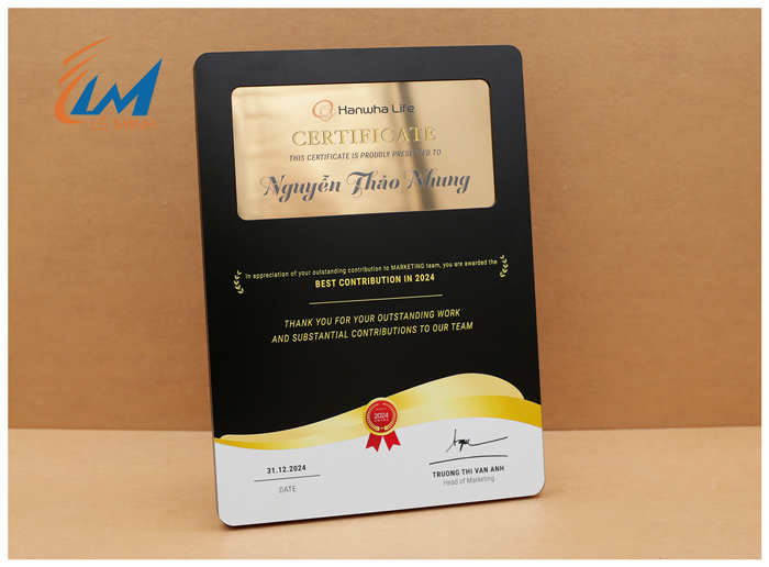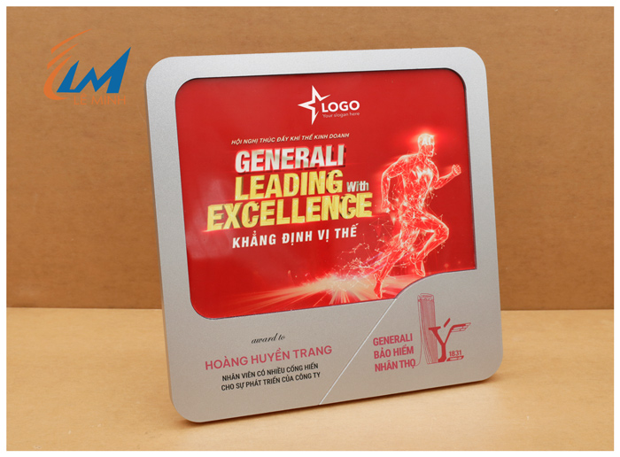 + Nội dung: In ấn sắc nét tên người nhận, thành tích doanh số, hoặc lời chúc ý nghĩa. Công nghệ in UV hoặc khắc laser trên kim loại đảm bảo nội dung không bị bay màu theo thời gian.