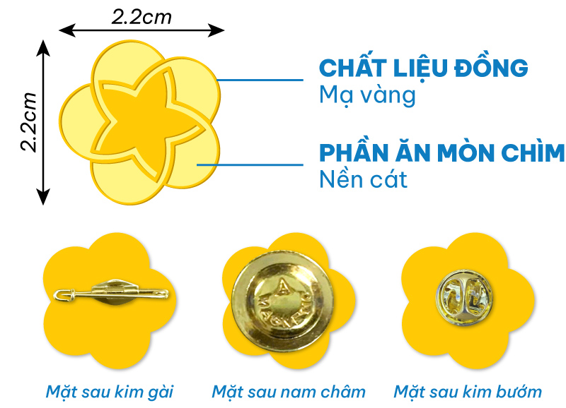- Mặt sau: Gắn kim gài, kim bướm hoặc nam châm