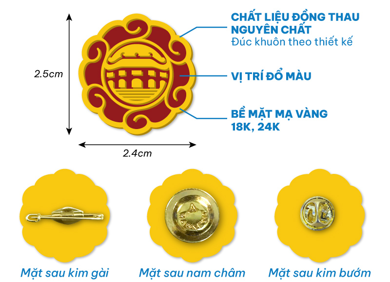 Huy hiệu đồng đúc khuôn, viền mạ vàng, màu sắc được phủ thủ công theo yêu cầu riêng. Tạo nên một dấu ấn thương hiệu không thể nhầm lẫn, vừa chuyên nghiệp, vừa độc đáo và vô cùng bền đẹp.